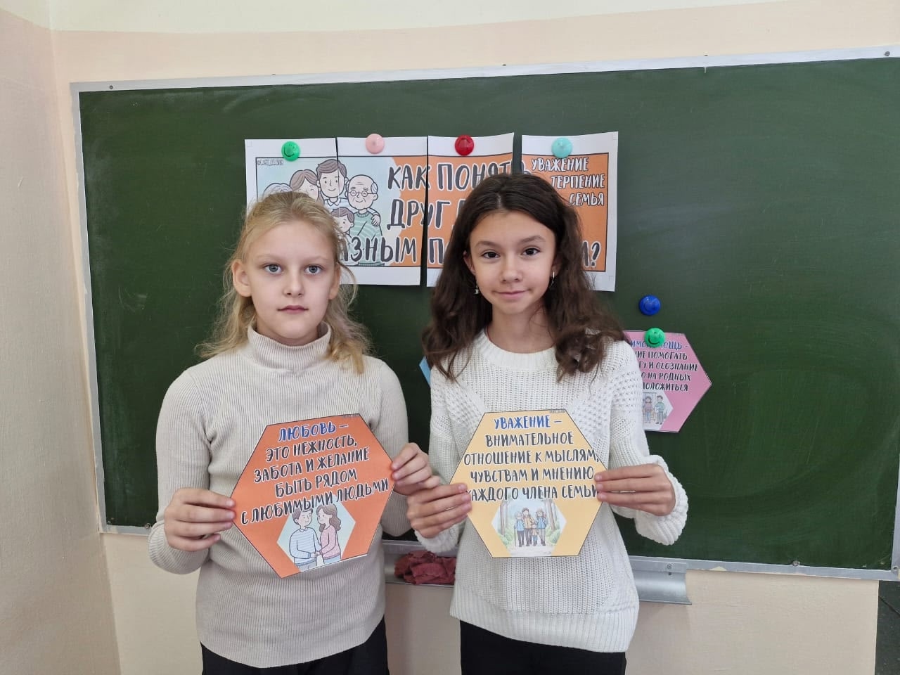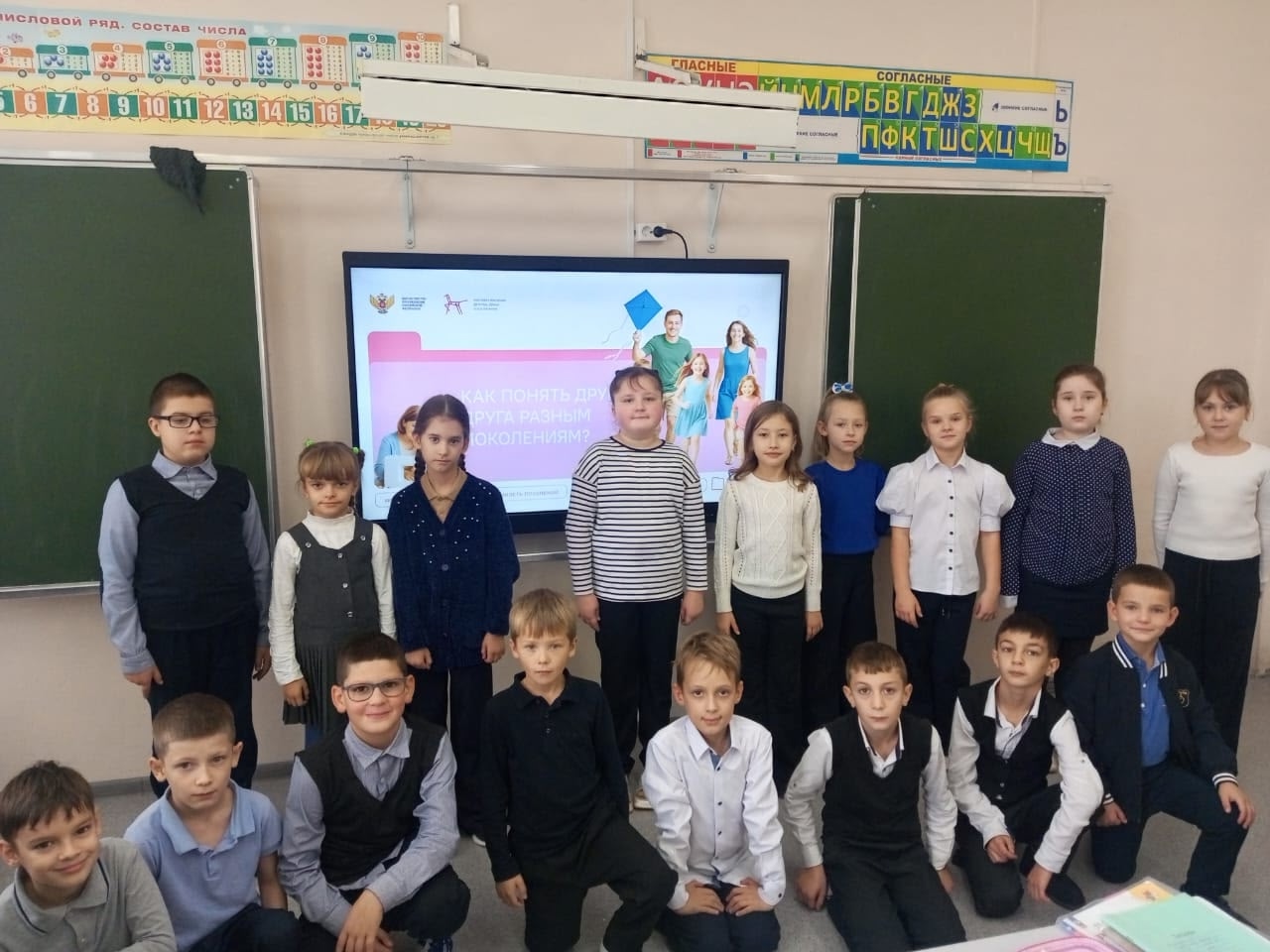В начальной школе, 1–4 классы, поговорили о том, что такое семья и что объединяет всех членов семьи. Учащиеся рассказали о своих близких: с кем они любят проводить время, какие темы обсуждают, на кого больше всего похожи или хотели бы быть похожими, какие традиции есть в их семье. Посмотрели фрагмент мультфильма «Трое из Простоквашино» и подумали, из-за чего происходили ссоры в семействе главного героя мультфильма — Дяди Федора — и что можно было бы посоветовать его родителям.